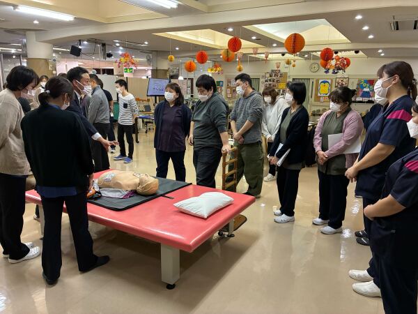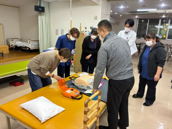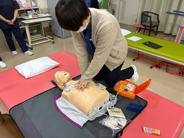 2日間に渡り、全職員がAEDの操作方法と心臓マッサージを実技を交えて開催しました。