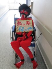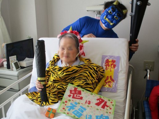 鬼がお部屋を回ると、驚いて目がまん丸になる方、金棒を持って鬼と戦う方、争い事が嫌いだと鬼と握手する方、鬼のカツラを取って被る方など、皆様それぞれの楽しみ方で行事に臨まれていました。