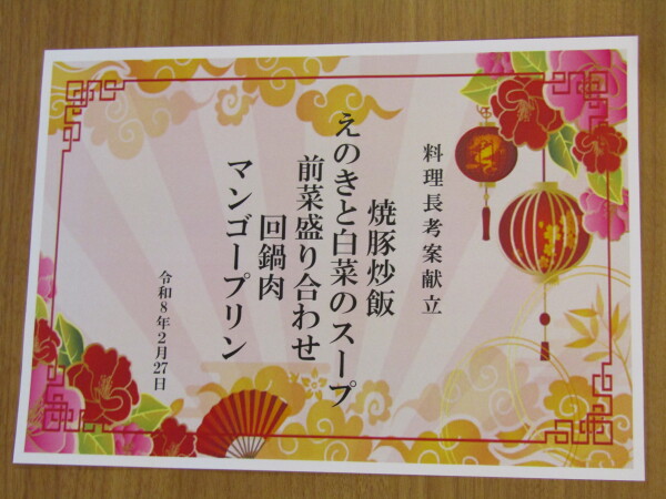 2月27日は料理長考案メニューで中華を。
