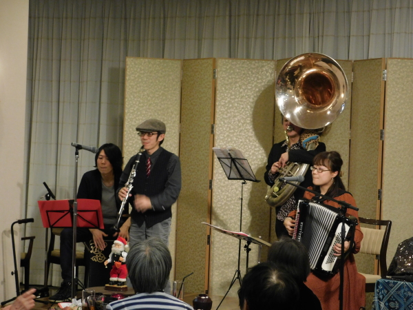 今回余興としてお呼びしたのは『Mucho Gusto』というバンドの方々でアコーディオンやスーザホン、クラリネット、カホンからなるノスタルジックなサウンドが特徴なアコースティックユニットです。陽気な音楽に途中、曲に合わせて踊りだす方もいらっしゃり、大いに盛り上がりました♪