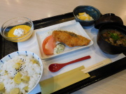 ・海老フライ、目玉焼き、コロッケ、鮭塩焼き