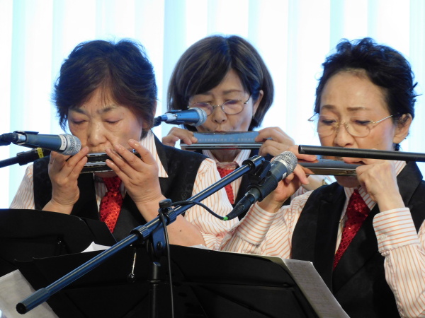 途中にはハーモニカの演奏で皆様と一緒に唄う場面もあったりと楽しそうな雰囲気でした。昔懐かしい曲を色々なハーモニカとギター・パーカッションなどを交えて演奏して頂き、あっという間の1時間となりました♪
