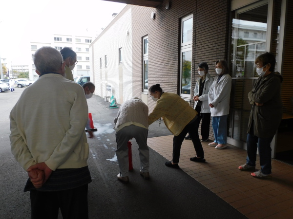 その後は実際に火災が起きたらどのようにしたら良いかなどの説明を受けたり、消火器の使い方に加え実際に皆様に水消火器を使い消火訓練をして頂いたりしました。