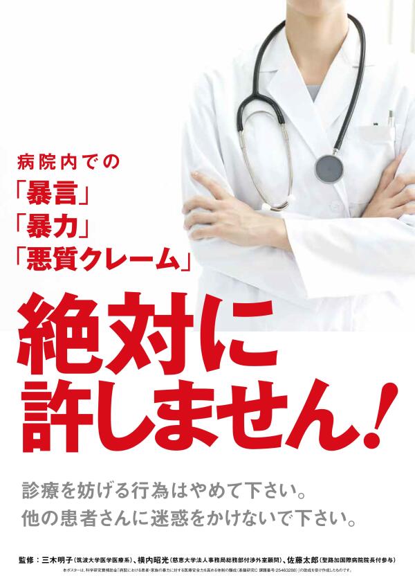 院内において、次のような迷惑行為があった場合、当事者と医療関係者との信頼関係が損なわれたとして、診療をお断りする場合があります。また、身の危険を感じる悪質な暴言などや犯罪行為が発生した場合は、警察に通報します。更に、悪質と判断した場合には、弁護士に相談の上、法律上厳格に対処いたします。